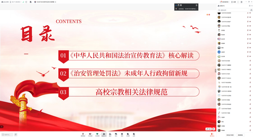 为深入学习贯彻习近平法治思想,提高校园法治宣传教育实效,进一步加强青年学生法治教育,2025年10月16日,beat365学工第一党支部青年学生法制宣传教育活动正式启动,在线上举办了法治学习教育会。党支部副书记周宇杰同志主持学习会,全体青年党员积极参与。